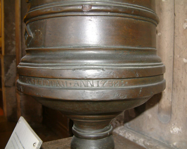 Inscrições "ANNO 1738"; Latim; "Ano de 1738" "IOANES V"; [No 1º reforço]; Latim; "D. João V" "ME FECIT CIPRIANUS CRANS IANSZ AMSTELODAMI"; [No liso do fogão]; Latim; "Me fez Cipriano Crans Jansz em Amesterdão" |  Imagens: 6 Participe Ajude-nos a completar a informação enviando-nos sugestões, perguntas ou os seus comentários |