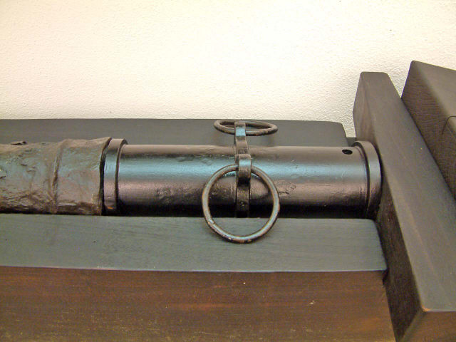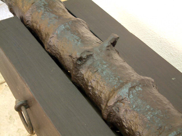 Descrição É uma boca de fogo de ferro forjado, formada por aduelas caldeadas em torno de um mandril que, depois de retirado, deixou aberta a alma da peça. Este tubo assim formado é reforçado com 19 cintas cujas juntas são cobertas por aneis para aumentar a solidez do conjunto. O tubo é aberto nas duas extremidades, não tem munhões, tem um grosseiro ponto de mira e vestígios de arganeos. Este tubo constituía a bolada da peça, pois falta a câmara móvel que continha a carga de pólvora e que era adaptada à extremidade posterior e na qual se abria o ouvido. Nesta boca de fogo esta câmara devia ter um comprimento de cerca de 65 cm de comprimento e era também formada por aduelas reforçadas com cintas e aneis, certamente de maior espessura que as correspondentes da bolada. A peça completa com a sua câmara teria assim, pouco mais ou menos, 3,40 metros de comprimento de alma e um comprimento relativo de 38 calibres. Lançava pelouro de pedra de 1,5 arráteis (0,690kg).