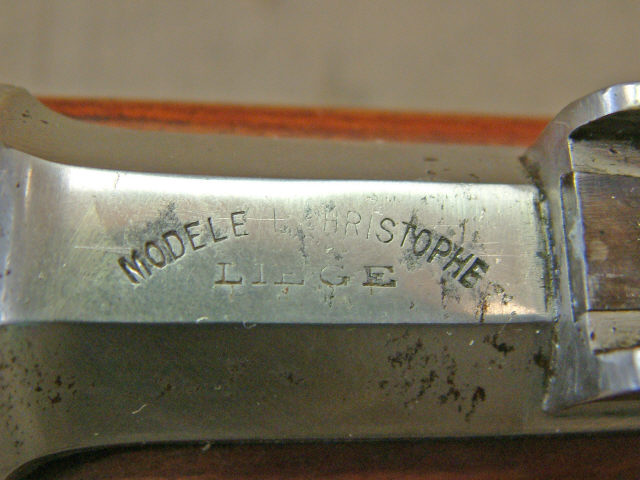 Marcas Punção; Um punção a quente ,de forma circular, com a inscrição: " L. CHRISTOPHE LIÉGE BREVETES 1883 ".; [Na coronha do lado direito];