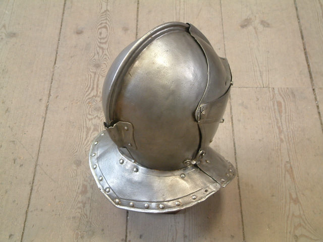 Descrição Protecção completa da cabeça em ferro forjado, batido e liso, composta por calva com crista e cocar posterior (para implantação da plumagem), babeira e gola posterior rebordada e rebitada com taxas de ferro. A viseira perdeu-se, tendo sido, entretanto, executada uma réplica.