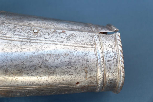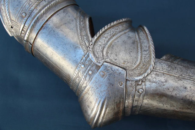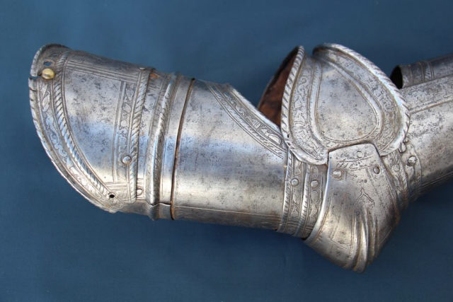 Descrição Parte de armadura para protecção do braço direito, com gravações a ácido representando motivos bélicos.