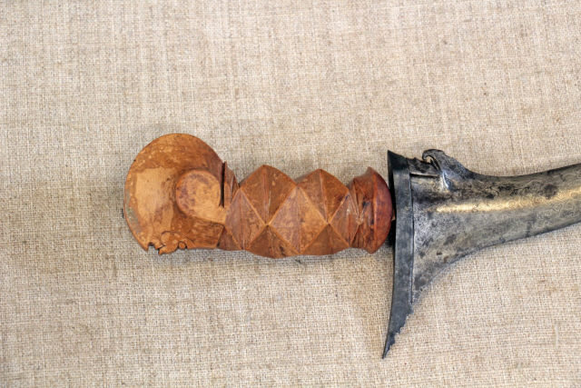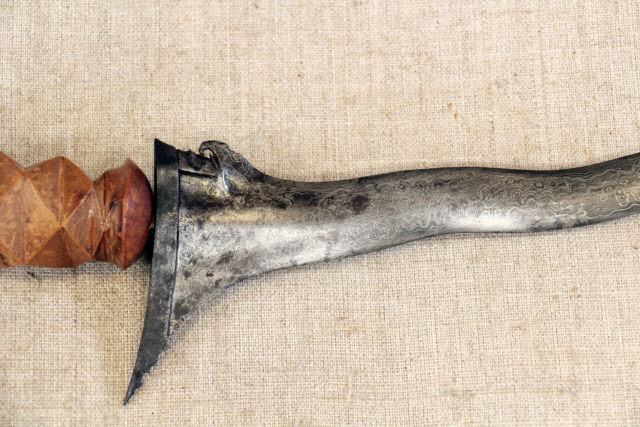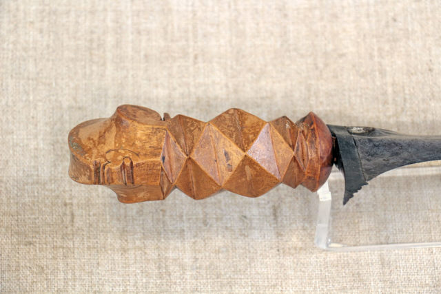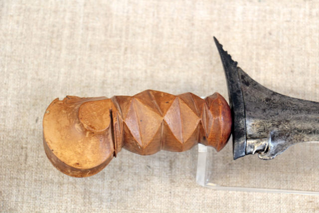 Descrição Lâmina ondulada e assimétrica, com dois gumes em aço damasquinado, com guarda e gancho, com fundo animado com irisações. Punho em madeira trabalhada com uma cabeça estilizada. Bainha de madeira (sândalo) com motivo floral.