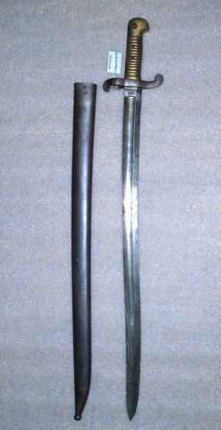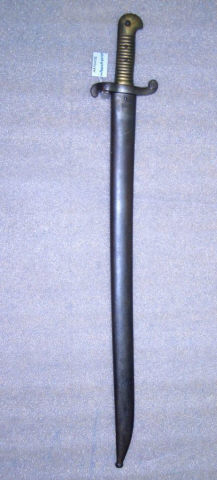 Descrição Sabre baioneta com lâmina de um só gume com goteira central em ambos os lados. Guarda em ferro de um só quartão. Do lado oposto ao quartão tem um orificio para enfiar a espingarda. A meio da guarda tem uma punção seguida do número 499. Punho em metal (latão) com veio na parte de cima. Bainha em ferro terminando em botão na ponta. A bainha tem uma ilharga de suspensão rectangular.