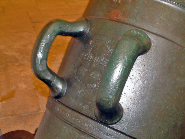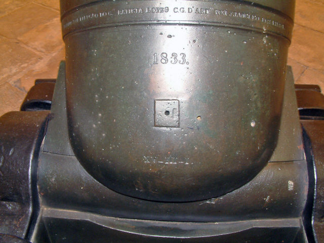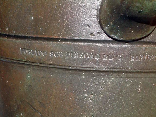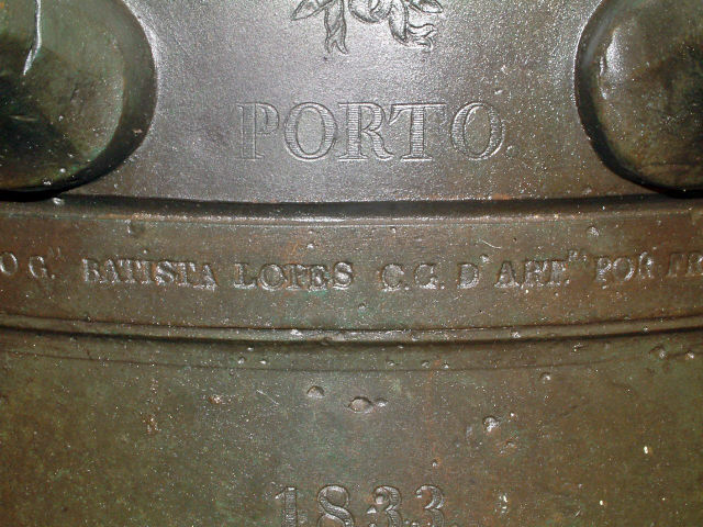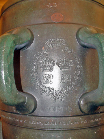 Descrição Boca de fogo, de 27,5cm de calibre. Na bolada nada há a assinalar. No reforço tem duas asas facetadas e entre elas estão gravadas as coroas do Brasil e de Portugal, encimando respectivamente as cifras de D.Pedro Imperador e de D.Pedro, Duque de Bragança; este conjunto é circundado por folhas de carvalho e encimado por uma coroa de louro; por baixo lê-se a palavra: " PORTO ". Na faixa que separa o reforço da culatra tem gravado: " FUNDIDO SOB A DIRECÇÃO DO G.AL BATISTA LOPES C.G. DA ART.A POR FRANCISCO JOSÉ ARANHA ". Na culatra, por cima do ouvido, lê-se a data: " 1833 " e por baixo o peso " XV - III - I ", isto é, 15 quintais, 3 arrobas e 1 arrátel. A câmara é troncocónica (encampanada). Está montado numa base de bronze com o peso de 25 quintais e 3 arrobas, conforme a inscrição que nela existe: "ARSENAL DO EXÉRCITO 1844 25 - 3 - 0 ".