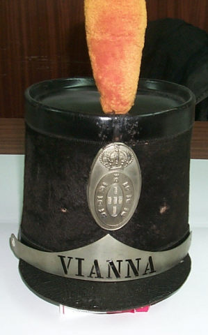Descrição Barretina de forma cilíndrica a que os ingleses chamavam "stove-pipe" ; confeccionado em feltro preto com um reforço de couro em toda a volta na parte inferior e superior, pala de couro envernizado, tudo da mesma cor. Por cima desta tem uma chapa de metal branco, estreita e do comprimento da pala, tendo ao meio a letras VIANNA em aberto, com bico ao meio; um pouco mais acima, está colacada outra chapa do mesmo metal e cor, em forma de elipse com as Armas de Portugal em alto relevo. Na parte supeiror possui um penacho em lã de cor laranja com uma haste em metal para introduzir na barretina pela parte supeiror.