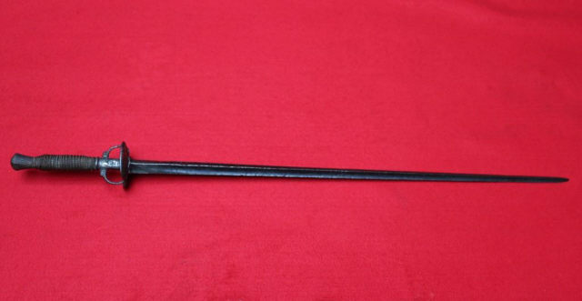Descrição Espadim composto, de meados do Séc XVIII. Possui: guarda em ferro, com embutidos de prata; punho em madeira, coberto a filigrana de cobre; pomo em madeira; e lâmina de secção triangular vazada.