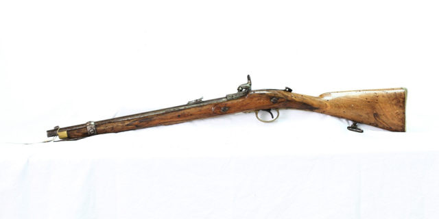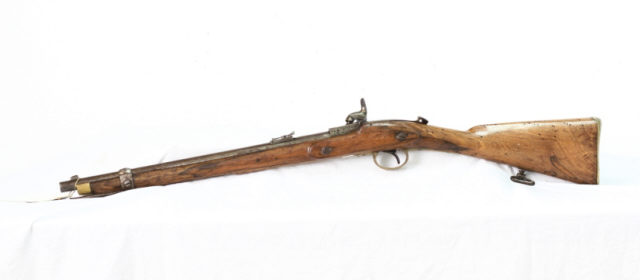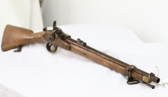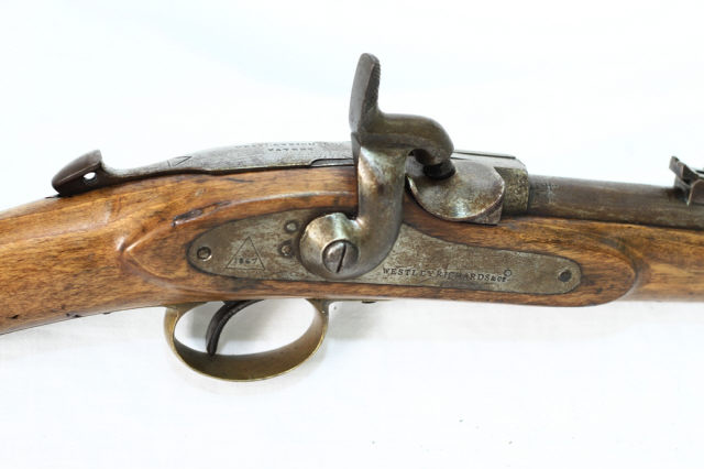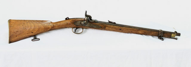 Descrição Carabina Westley Richards, Modelo (m/) 1867, calibre 11,45 mm, utilizada pelas tropas de Cavalaria do Exército Português, durante as Campanhas de Pacificação, em África, no final do século XIX.