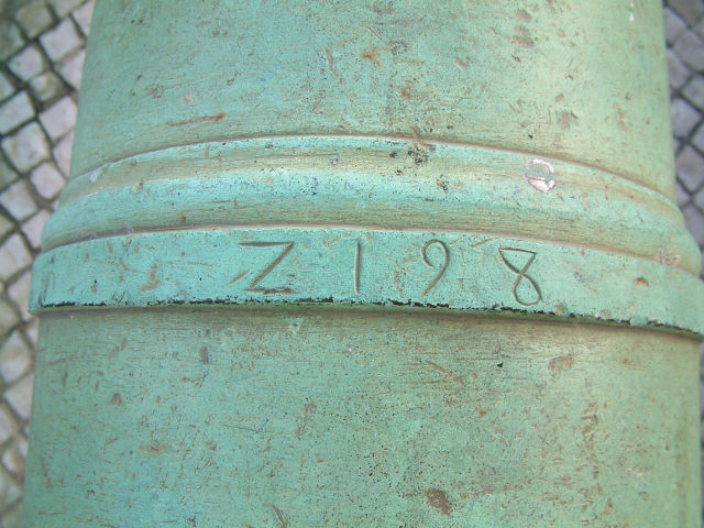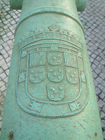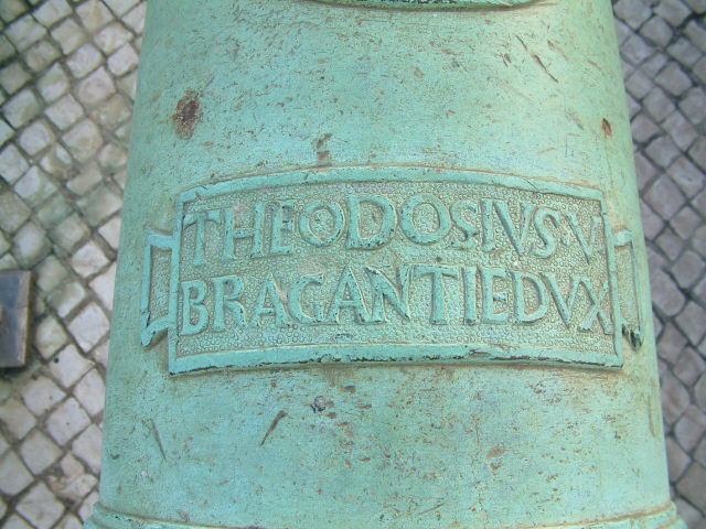 Descrição Boca de fogo, de 10,5cm de calibre. No 1º reforço ostenta as armas do 5º Duque de Bragança, D.Teodósio I e a inscrição " THEODOSIVS.V.BRAGANTIE DVX ". No 2º reforço tem as asas partidas, como partidos estão os suportes para a tampa do ouvido, e o botão do cascavel. Na faixa que divide os dois reforços tem marcado o peso " 2198 " arráteis. Culatra e cascavel ornamentados com folhas de acanto, à maneira de Halut. Na faixa alta tem inscrito " OPVS REMIGY DE HALVT " e "...O 1561 ", e " Rda ".