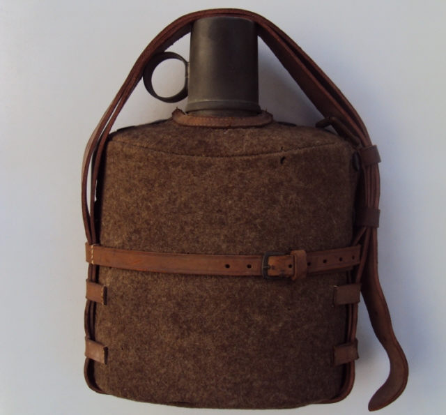 Descrição Cantil em cobre e estanho m/Inglês com capa em tecido preso com botões em mola, quatro passadores em couro fixos ao tecido, duas correias , uma de suspensão com fivela ajustável e outra de fixação. Possuí tampa de cortiça e copo em estanho.