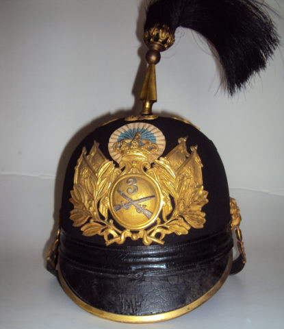 Descrição Capacete em couro, latão e tecido.Este Capacete é composto por copa (com dois respiros circulares em rede), pala, cobre nuca e uma faixa de reforço em couro envernizados a negro. A chapa, a cruzeta, o pico, as guarnições, e duas cabeças de leão são de metal amarelo. O monograma com o número do Regimento e as Armas são em metal. Possuí forro em tecido e couro. Possuí penacho de crina preta e correia com fivela ajustável.