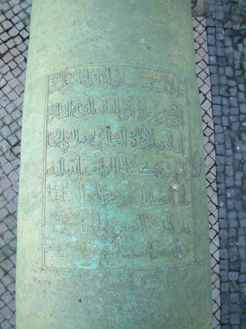 Descrição Boca de fogo, de 23,5cm de calibre. No reforço encontram-se dois pequenos munhões, desproporcionados em relação à grandeza da peça, que entram numa caixa por modo a permitir dar inclinação à peça no plano vertical. Na bolada vê-se uma inscrição em relevo, dentro de um rectângulo " DO NOSSO SENHOR O SULTÃO DOS SULTÕES DO TEMPO; VIVIFICADOR DA TRADIÇÃO DO PROFETA DE (DEUS) MISERICORDIOSO; QUE COMBATE PELA EXALTAÇÃO DOS PRECEITOS DO CORÃO; DERRUBADOR DOS FUNDAMENTOS DOS PARTIDÁRIOS DA IMPIEDADE; QUE AFASTA AS HABITAÇÕES DOS ADORADORES DOS ÍDOLOS; VENCEDOR NO DIA DO ENCONTRO DOS DOIS EXÉRCITOS; HERDEIRO DO REINO DE SALOMÃO; CONFIADO EM DEUS BENFEITOR; POSSUIDOR DAS VIRTUDES; BAHADUR XAH, SULTÃO; ESTA PEÇA FOI FEITA A 5 DO MÊS DE DHULKÁDAS, ANO DE NOVECENTOS E TRINTA E NOVE ". O cascavel é plano.