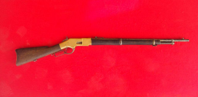 Descrição Carabina de Repetição com carregador tubular menor que o cano e culatra em latão dourado. Manobrador da culatra constituído por uma alavanca que roda sobre um eixo por debaixo do gatilho e patilha de segurança. Possuí três braçadeiras ao longo do cano e duas argolas, uma na coronha e outra no cano, para fixação da bandoleira. Aparelho de pontaria constituído por alça de ranhuras multiplas com cursor e ponto de mira de secção triangular.