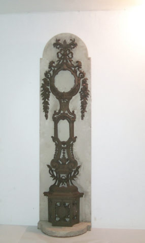 Descrição Custódia de bronze fundido com uma base de três modulos, tendo cada um as letras R B M inseridas num escudo oval rodeado com motivos vegetalistas. A parte superior apresenta duas aberturas, uma em circunferência na parte superior e outra ovoide na parte intermédia estando entre elas um escudo com as letras R e X sobrepostos. Todas estas formas estão decoradas com motivos vegetalistas em toda a sua extensão. A peça está suportada numa base em madeira pintada a branco.