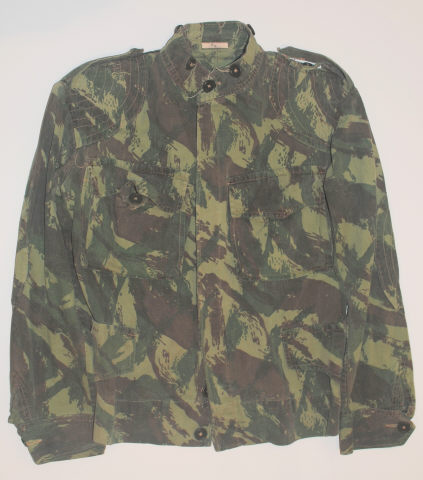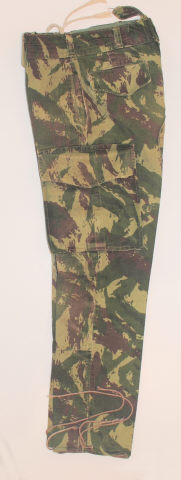 Descrição Farda camufalda, modelo de 1961, utilizada pelas tropas portuguesas no Ultramar, composta por três peças: calças, dólmen e cobertura de cabeça (vulgo "Quico"), em padrão camuflado.