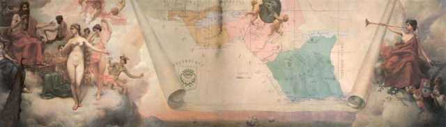 Autorias Carlos Reis [Pintor]; Citando José Augusto França, no livro Pintura e Escultura no Museu Militar, pag.43, esta tela seria de dupla autoria de Carlos Reis e Manini. ".......Mas o tecto completa-se na grande parede do fundo em que Manini colaborou também, desenrolando, entre as figuras de Carlos Reis, um mapa de Moçambique....." ".....Esta parede tem, assim, dupla autoria, do cenógrafo e do pintor, mas é no segundo caso que ela adquire toda a importância....."