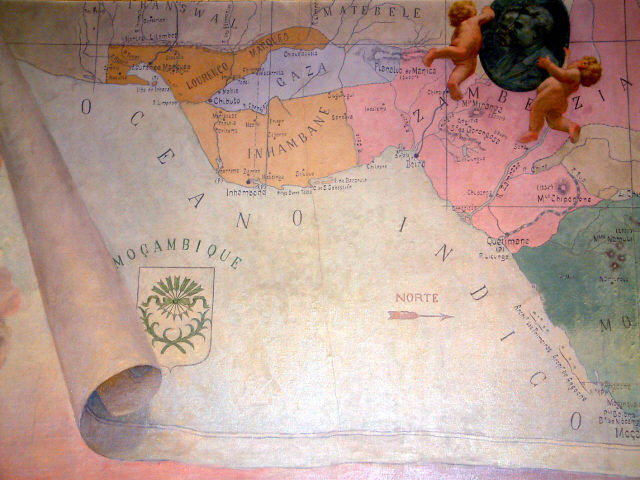 Descrição Uma grande tela cobrindo a parede principal, tendo ao meio o mapa da provincia de Moçambique, à esquerda Jupiter escutando Vénus cercada pelas três Graças, e que lhe pede protecção a favor dos portugueses, apontando as naus que se dirigem à India.