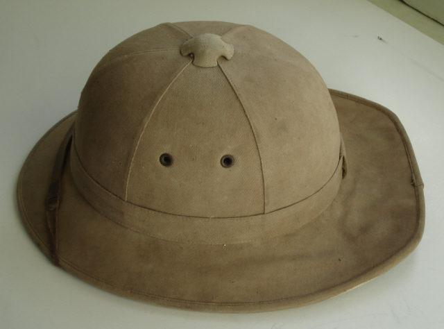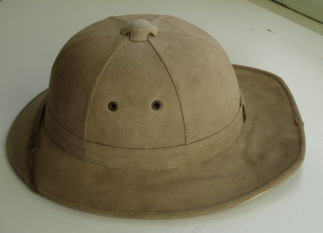Descrição Capacete Colonial, de tela de cortiça impermeável, coberto de caqui de algodão amarelo torrado, com francalete de cabedal, tendo a parte interior duas abas de tecido verde.