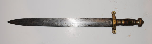 Descrição Terçado de artilharia, constituído por lâmina e punho. Lâmina dupla, em metal. Punho totalmente feito em bronze, apresentando em toda a sua volta desenhos circulares paralelos em relevo manufaturados, com dupla função, decoração e anti-derrapante.