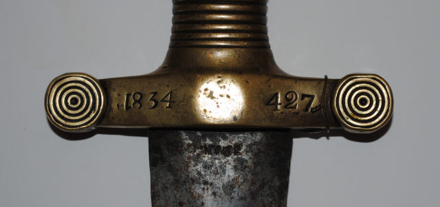 Marcas Data; 1834; Gravada Numeração Árabe; [No guarda mão]; O número 1 encontra-se invertido. Inscrição; 427; Gravada Numeração Árabe; [No guarda mão]; |  Imagens: 2 Participe Ajude-nos a completar a informação enviando-nos sugestões, perguntas ou os seus comentários |