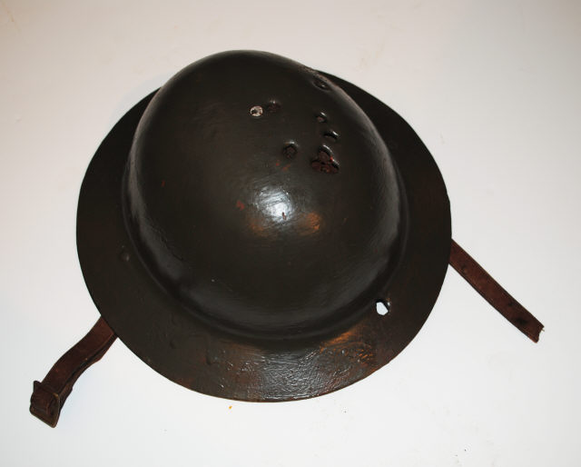 Capacete militar, da Grande Guerra 1914-1918 (?), feito em metal. Apresenta nove buracos, aparentemente realizados por balas. No seu interior, pregado no fundo, possui um círculo feito em couro. Desse mesmo local, presa nas laterais por duas presilhas em metal, pregadas ao capacete, sai uma correia igualmente em couro, com fivela em metal, com o objetivo de segurar o capacete, quando colocado na cabeça.